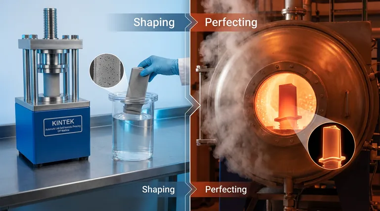 | 主要目标 | 塑造成均匀的“生坯”零件 | 致密化至完全理论密度 |